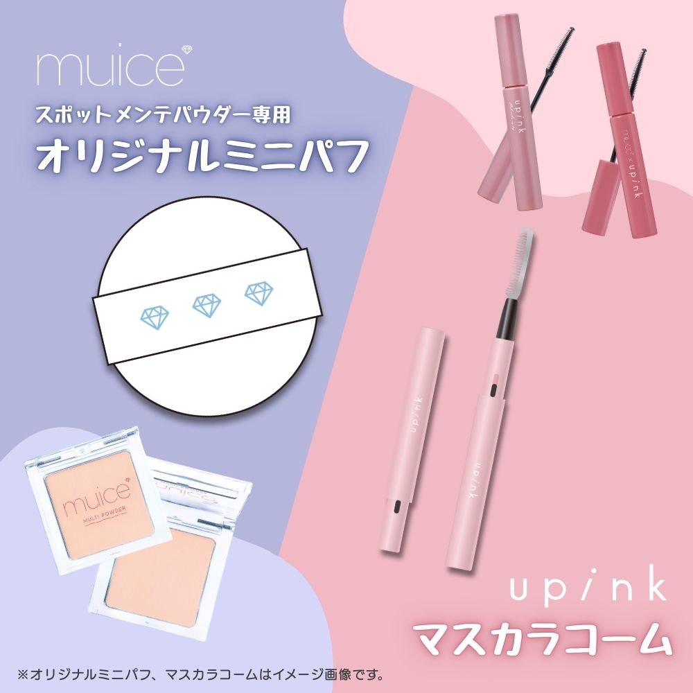 →「muice スポットメンテパウダー用オリジナルミニパフ」「upink スライドコームマスカラ」のプレゼント