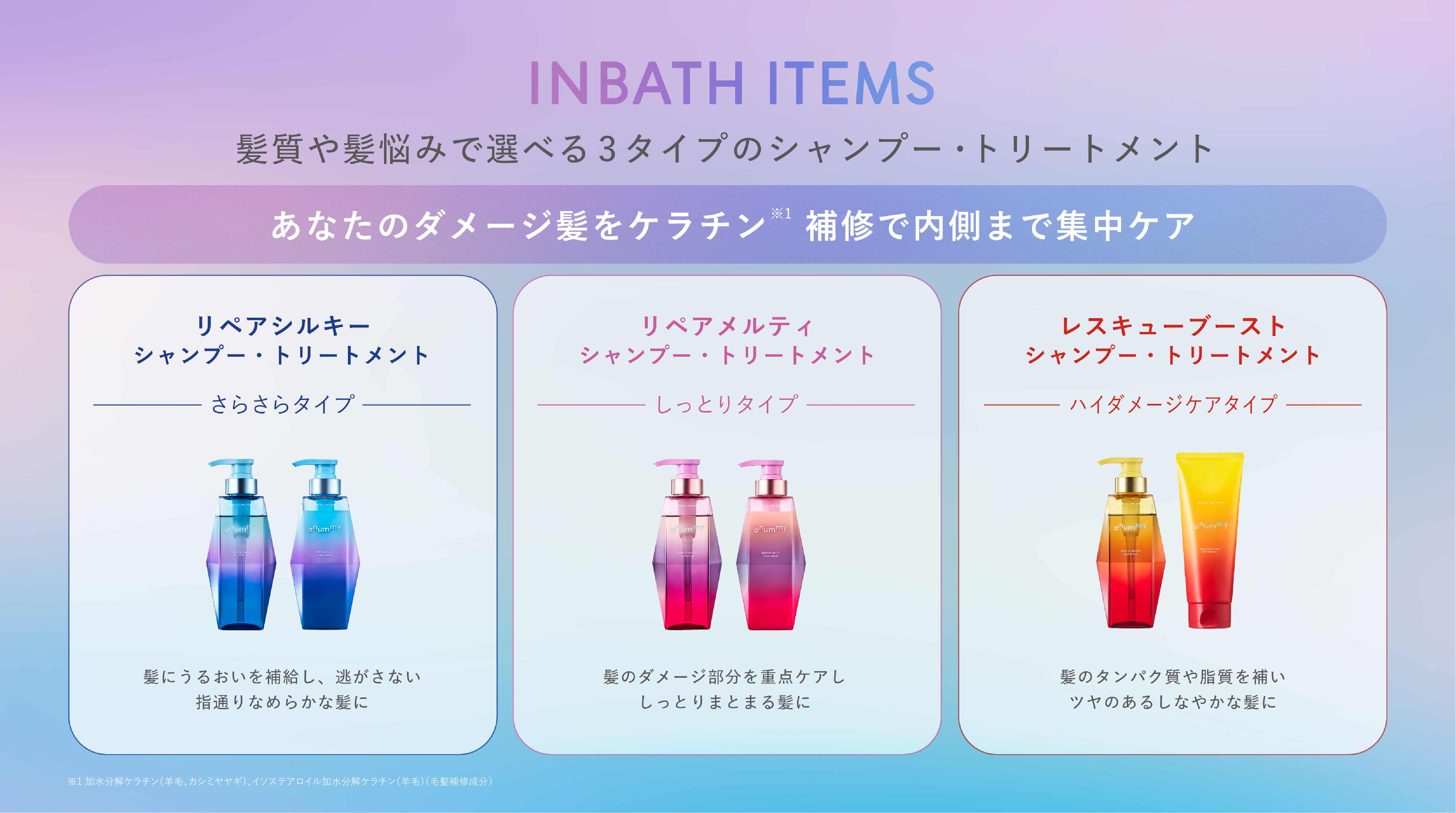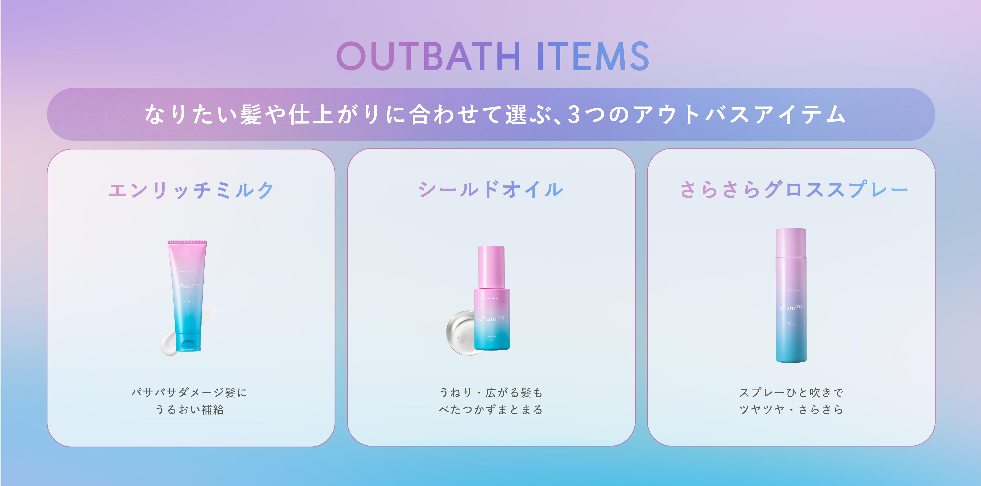 そのほか、なりたい髪や仕上がりに合わせて選べる、3種類のアウトバスアイテムも展開しています。
