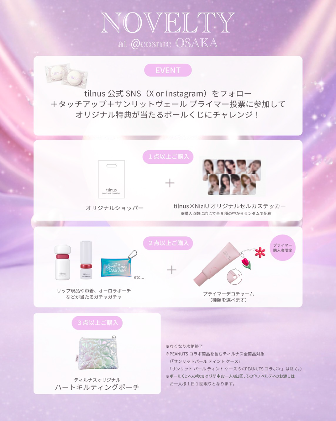 ・1会計につき1点以上購入:オリジナルロゴショッパー+tilnus×NiziUオリジナルセルカステッカー(購入点数に応じて)