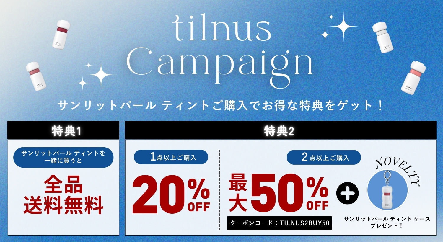 この度、tilnus サンリットパール ティントご購入でお得な特典をプレゼントするキャンペーンを開催いたします。お得なこの機会にぜひお求めください!