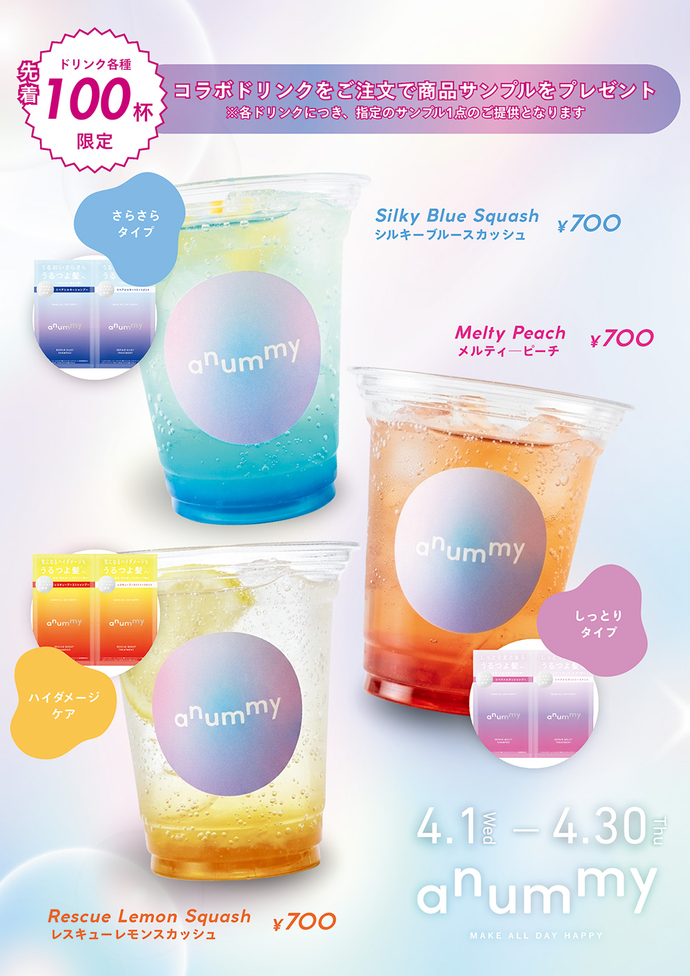 スパ ラクーア9Fの「Dayoffcafe」にて、「anummy」のサンプルがセットになった限定ドリンクメニューを販売いたします。ドリンクは、3タイプのシャンプー&トリートメントそれぞれをイメージした全3種類をご用意。