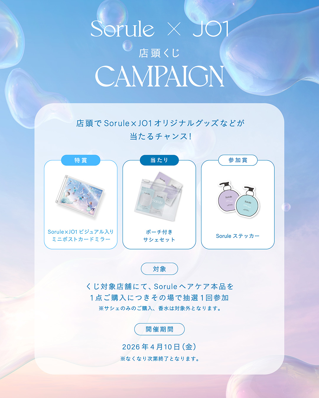 ・くじ対象店舗にて、Soruleヘアケア本品を1点ご購入につきその場で抽選1回参加