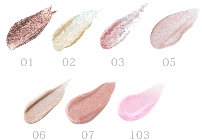 小さめのシルバーグリッターとレインボーグリッターをリッチに配合。肌なじみがよく透明感のある4種のパールを配合。