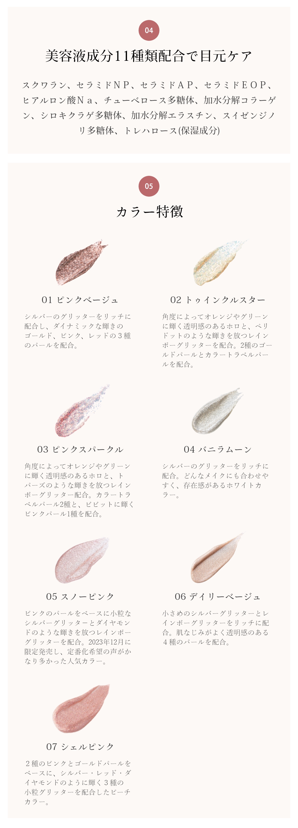 水、グリセリン、BG、ポリグリセリン−3、デキストリン、(アクリル酸ヒドロキシエチル/アクリロイルジメチルタウリンNa)コポリマー、クレアチン、トレハロース、スクワラン、フェノキシエタノール、(アクリロイルジメチルタウリンアンモニウム/VP)コポリマー、メチルパラベン、イノシトールオリゴ糖、ポリソルベート60、エチルヘキシルグリセリン、フクロフノリエキス、加水分解コラーゲン、シロキクラゲ多糖体、チューベロース多糖体、ラウロイルラクチレートNa、加水分解エラスチン、セラミドNP、ヒアルロン酸Na、セラミドAP、フィトスフィンゴシン、コレステロール、スイゼンジノリ多糖体、キサンタンガム、カルボマー、セラミドEOP、PET、合成フルオロフロゴパイト、酸化チタン、ポリブチレンテレフタレート、ホウケイ酸(Ca/Al)、マイカ、酸化鉄、ポリメタクリル酸メチル、シリカ、ホウケイ酸(Ca/Na)、酸化スズ、銀、ポリウレタン−11、アクリレーツコポリマー、Al