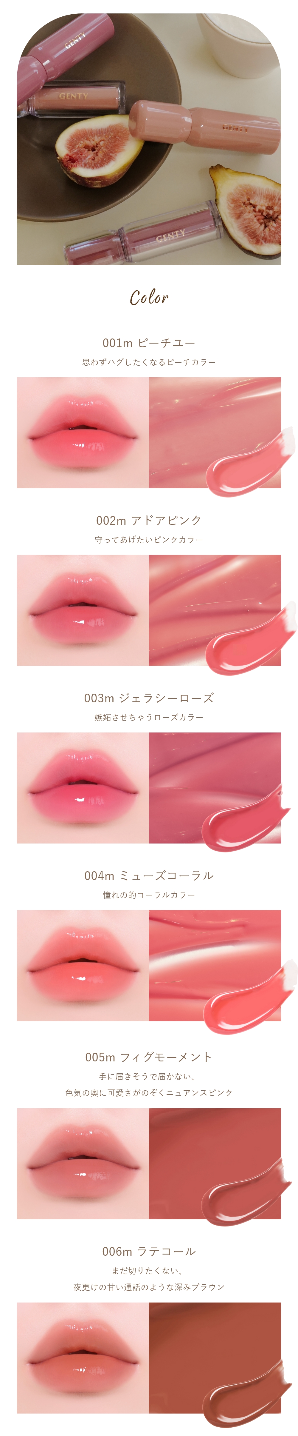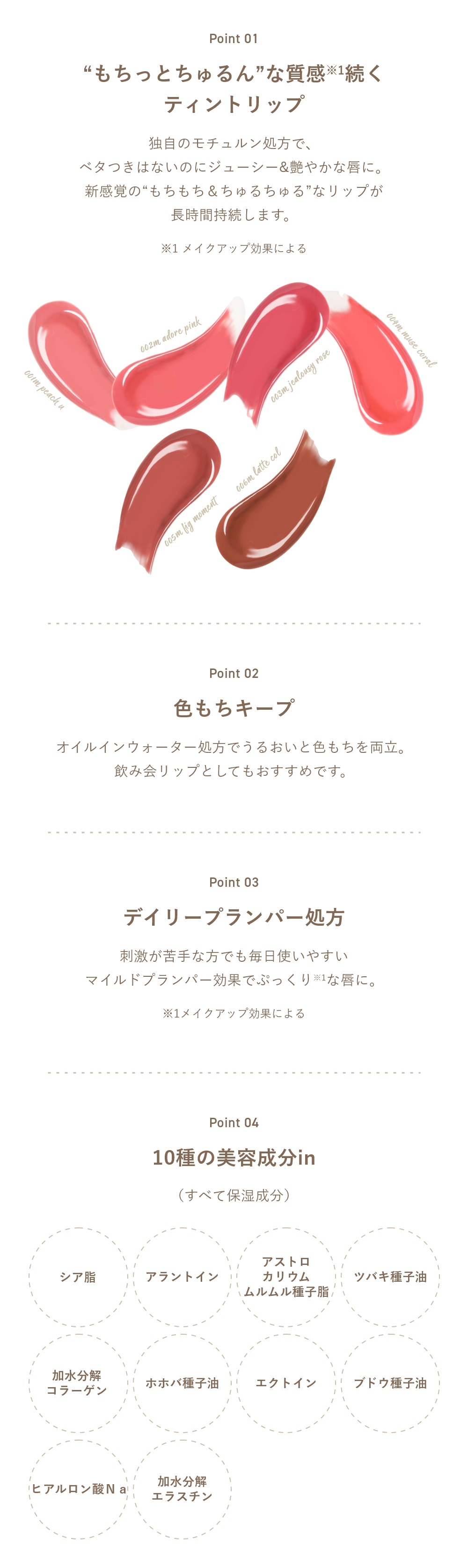デイリープランパー処方によるもちっとちゅるんな質感や、色もちの良さ、美容成分はそのままに、ヌーディーカラーを使ったときに気になる“顔写り”がよく見えるバランスにこだわり、秋冬のムードを高めてくれる深みのあるニュアンスカラーに仕上げています。
