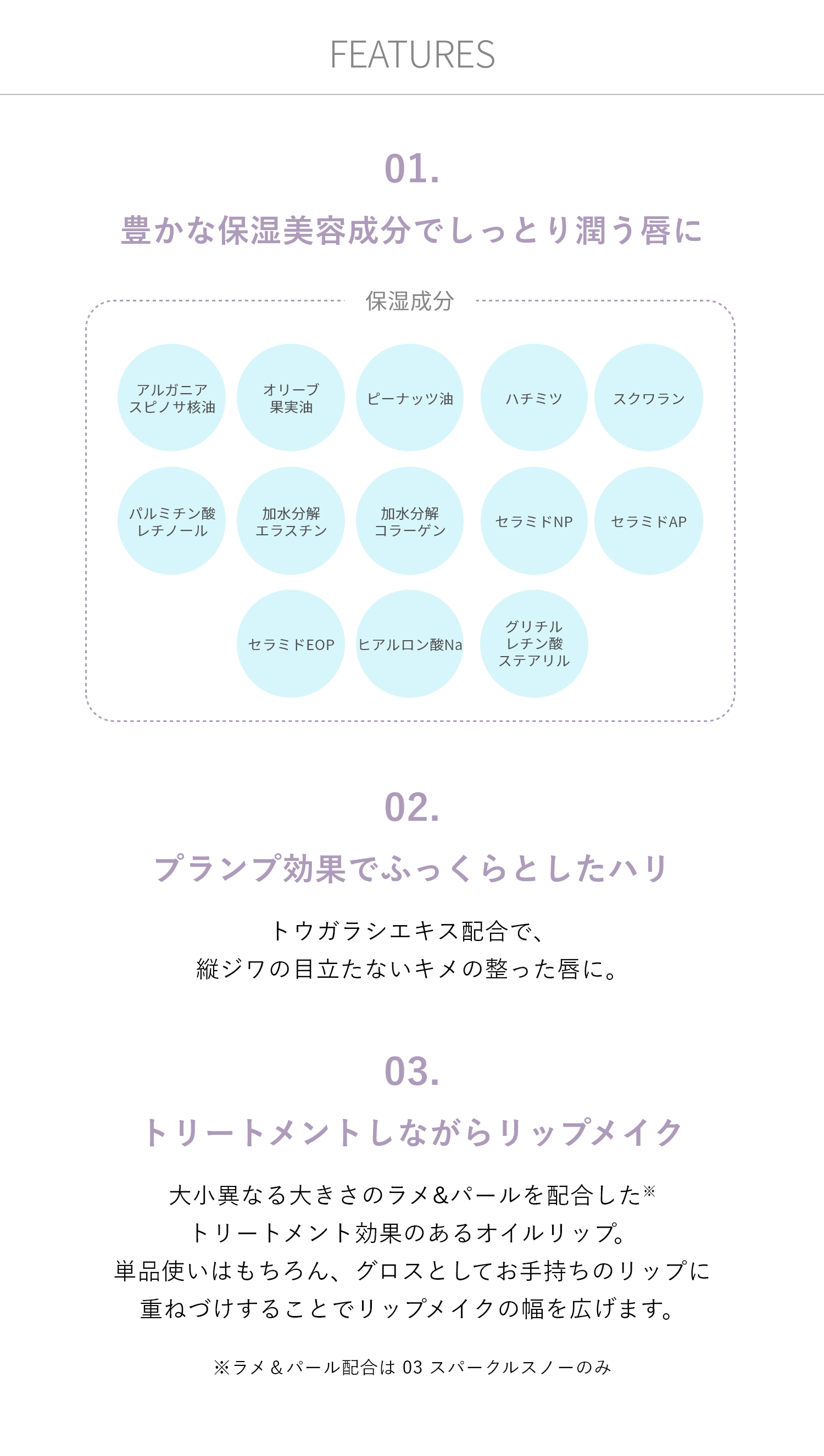 フィット力の高いオイルが唇をラッピングして、唇を保湿します。