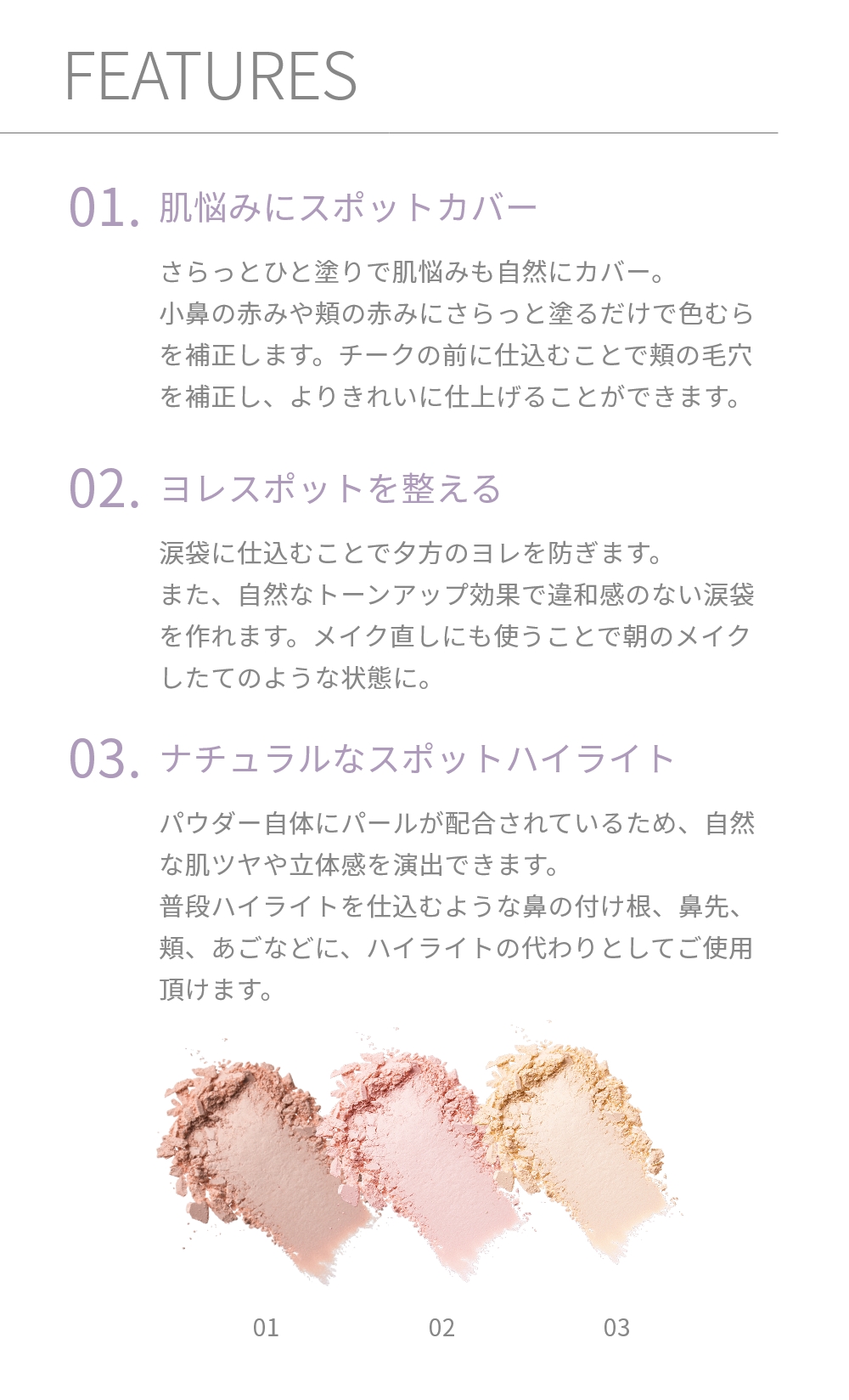 合成フルオロフロゴパイト、窒化ホウ素、シリカ、タルク、ジメチコン、ナイロン-12、パーフルオロヘキシルエチルトリエトキシシラン、水酸化Al、トリ(カプリル酸/カプリン酸)グリセリル、ジフェニルシロキシフェニルトリメチコン、セスキイソステアリン酸ソルビタン、ステアリン酸、ワセリン、クロルフェネシン、デヒドロ酢酸Na、トコフェロール、塩化Al、加水分解コラーゲン、スクワラン、ヒアルロン酸Na、マイカ、酸化チタン、酸化鉄、グンジョウ