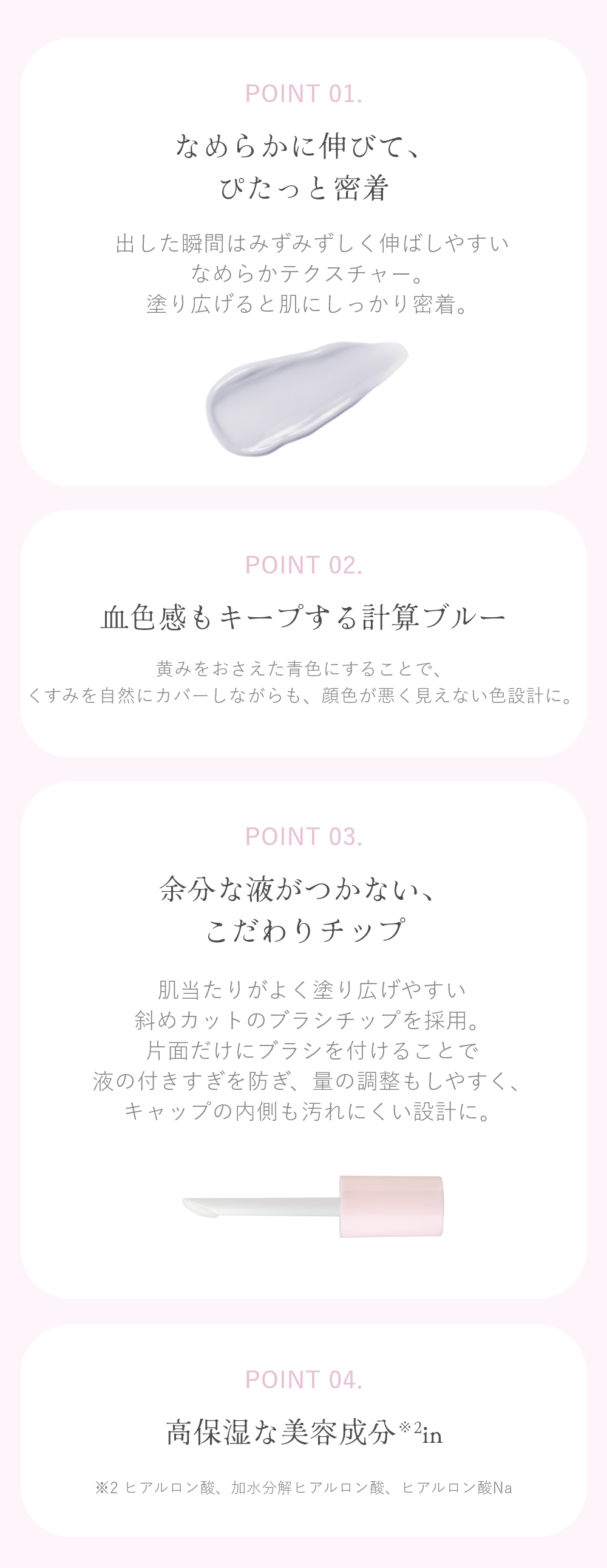 スキンケアでお肌を整えたあと、または化粧下地のあとにチップに液を適量とり、肌の明るくしたい部分に塗布してください。