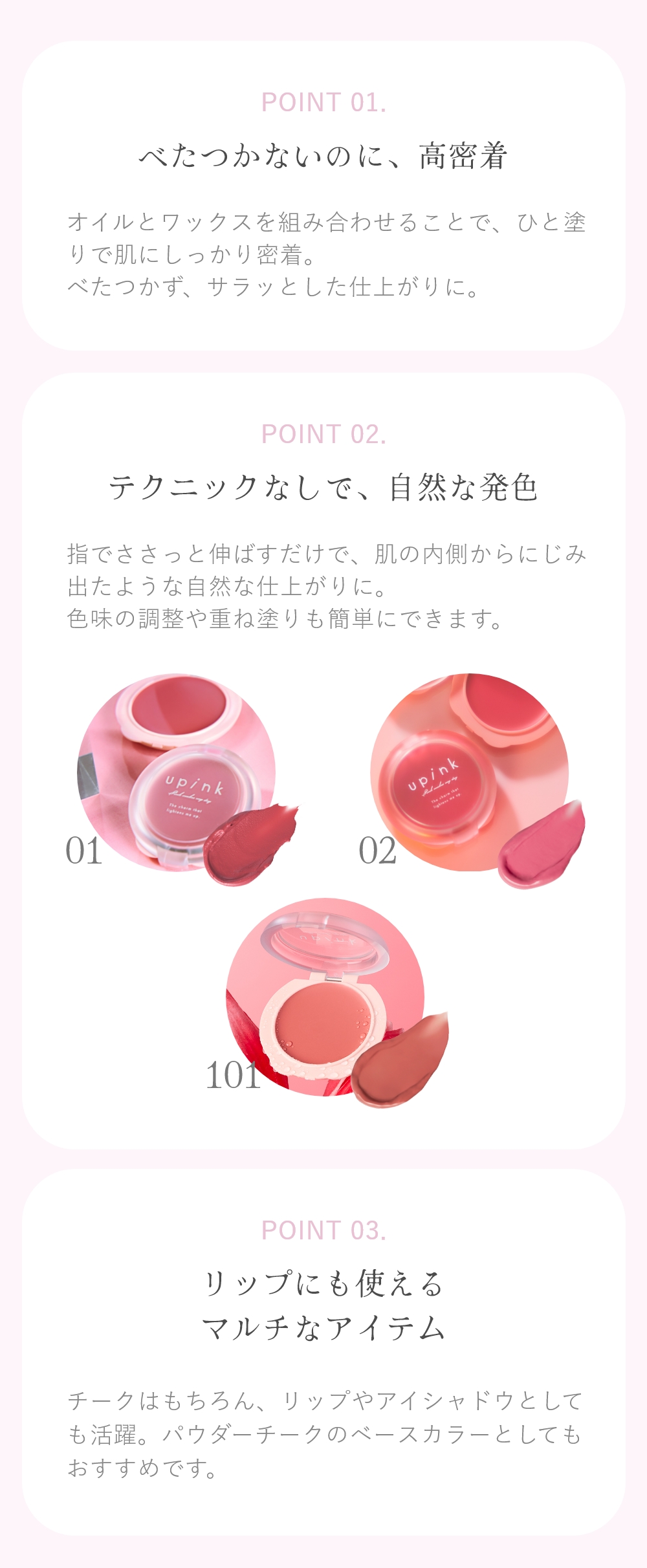 指先またはスポンジに少量を取り、軽く肌におくように馴染ませてください。リップとしてもお使いいただけます。